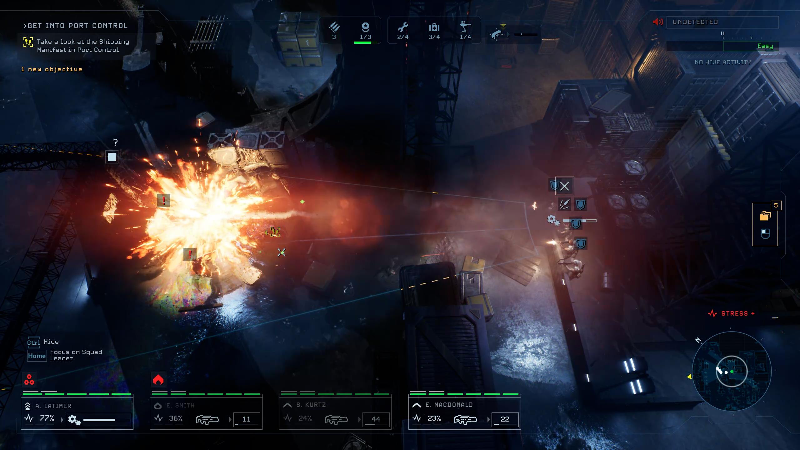 Your marines are equipped with a rather forgiving radar system that lets you know when threats are around. Sometimes you can take the action to your enemies, other times the enemies take the action to you, and once you’re detected you’ll become hunted. This means enemies will actively track your squad down until the timer runs out. It’s a great way to keep pressure on your team and I quickly learned that the faster you move through a mission the easier they are to complete.